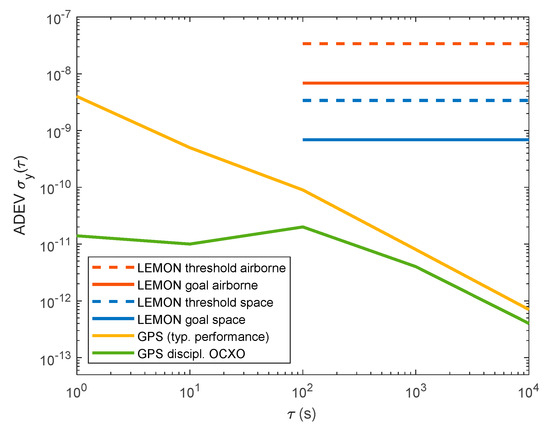 Figure 18. Stability requirements (Allan deviation, ADEV) for the LEMON airborne instrument and future spaceborne instruments together with typical stability performance of Global Positioning System (GPS) and a GPS-disciplined oven-controlled quartz crystal oscillator (OCXO).