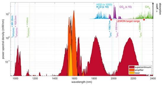 Figure 19. Laser spectrum together with spectrum after fiber amplifier and supercontinuum generated in a nonlinear fiber. In addition, the relevant absorption bands for the molecules are shown together with the interrogation wavelengths generated by the emitter.