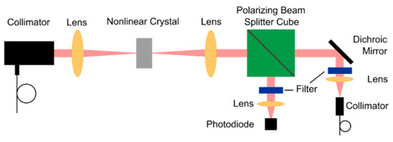 For the optimization of the design, the key goal was to reach maximum output pulse energy. The proprietary software package OPT [42] was used for the calculations, in which radiation fields are represented in two-dimensional, complex-valued arrays (field containers), in which the transverse intensity and phase distribution were stored. Optical elements, nonlinear media, and near-field propagators were implemented in the software package and operate on the field containers. To numerically solve the nonlinear differential equations in the medium, monochromatic plane waves are assumed. The temporal pulse shape was modeled using the finite element method. Additionally, transversal and temporal Gaussian intensity distributions of the pump pulses were assumed.