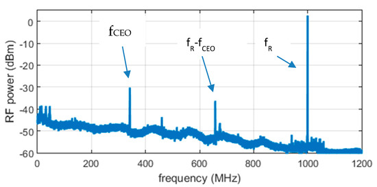 Figure 21. Radio frequency (RF) spectrum of the photodiode signal of the f-2f interferometer showing the carrier-envelope offset frequency (fCEO) and repetition rate fR signals used for stabilization.