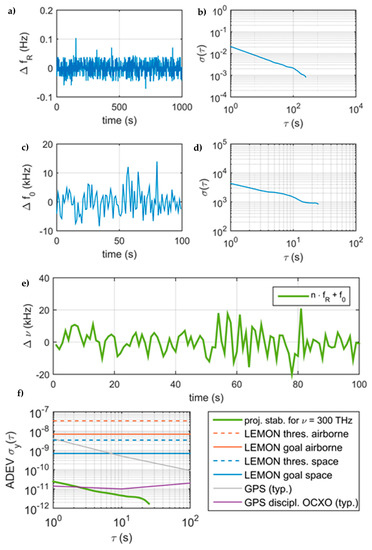 Figure 22. Frequency measurement (a) and stability of the stabilized repetition rate (b), frequency measurement of the offset frequency (c), and its stability (d). Combined frequency behavior of an optical comb mode at a wavelength of 1 µm (e) and achieved stability in comparison with performance requirements (f).