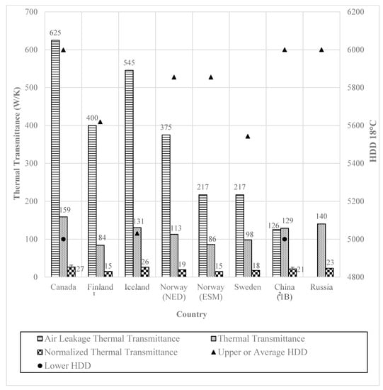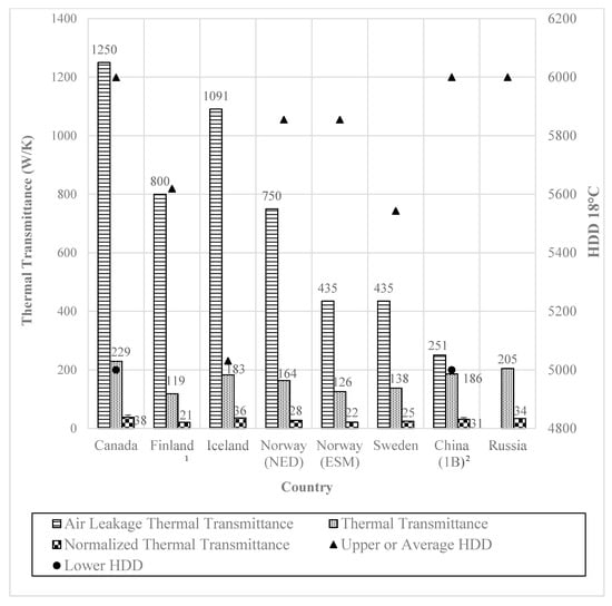 The literature reviewed in Section 2 indicates that, aside from the similarities in terms of climatic conditions, significant dissimilarities, regarding the requirements and approaches used to govern the energy performance of building envelope of new residential buildings, exist in the investigated countries. For the purpose of comparing the influences of those dissimilarities in the context of a whole building case (instead of per unit wall or floor area) between the previously outlined jurisdictions, two hypothetical buildings, named X1 and X2, representing large and medium size residential buildings, are used as a basis for analysis. The analysis is focused on the total thermal transmittance of the solid envelope components and the thermal transmittance related to air leakage, . accounts for the walls above grade, roof, and windows. Equation (1), below, was applied to these areas and RSI requirements by their respective building code. Tabular results are located in Table 14 and Table 15. The Appendix A provides supplementary information (Table A1 for building configurations and Table A2 and Table A3 for the thermal transmittance values of each building component of all countries of interest). Equations (2) and (3) were used to calculate the air leakage thermal transmittance, tabular results found in Table A4. Equation (4) shows how the total thermal transmittance calculated in Equation (1) was normalized by the HDD of each country or region in order to show a more representative comparison that considers the range of climatic conditions between the different countries and regions.