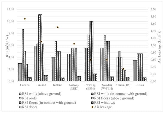 As observed in Figure 1, Canada and Finland have the highest and lowest thermal transmittance values through the building envelope, respectively, through Building X1. Both climates are found to have similar HDD values, with Canada (climate zone 7A) ranging between 5000 and 5999 and Finland averaging 5619. Finland’s thermal transmittance limits for building envelope components are significantly lower than Canada’s, especially with respect to roofs and fenestrations. Canada’s results of a high thermal transmittance through the building envelope are due to the fact that Canada specifies the lowest RSI value for exterior walls as noted below in Figure 2. The RSI required by the NBC 2019 is just about 50% of that specified for residential buildings in Norway (i.e., alternative approach—Norway-ESM) and Finland. In terms of airtightness, which is used as inputs for energy simulations when the performance path chosen as method of compliance, China is found to be the country with the strictest requirements, while Canada is the least strict. It should be noted that these are the only two countries in this paper for which values of air leakage are given to use in energy simulations, but not actually enforced.