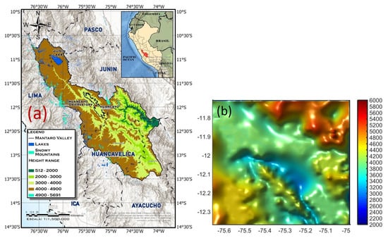 (a) The domain of the Mantaro river basin (MRB) and the Mantaro valley (MV). Geopolitical and altitude contours and the location of the HYO are indicated; (b) topography around the MV, with higher altitudes close to 5000 m asl.