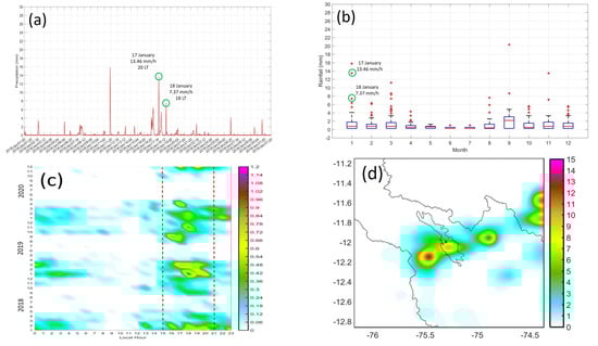 In addition, the maximum rainfall peak on 17 January (13.46 mm h) was lower than the maximum climatological (1965–2019) daily accumulated rainfall, as shown in Figure 6d, with maximum values close to 42 mm day in January, and approximately equal to the climatological percentile 90% (14 mm day) for the same month. Monthly and diurnal cycles of mean hourly accumulate rainfall during 2017, 2018, and 2019 are shown in Figure 3c. It is important to note that the highest amount of rainfall occurred between August and March at 15 LT and 21 LT for all years. Particularly, during 2018, the highest mean hourly rainfall occurred in January at around 18 LT. The spatial distribution of rainfall rate estimated by GPM system for 17 January 2018 at 21 LT is shown in Figure 3d. Four areas of high precipitation rate that aligned from north-east to south-west with a core of 7 mm h above the HYO were observed.