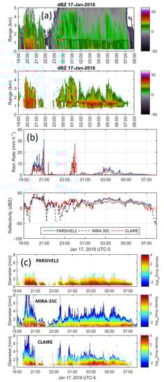 (a) Time series (UTC-5) of reflectivity (dBZ) obtained from the Magnetron-based cloud radar (MIRA-35C) (top figure) and CLAIRE (bottom figure) above the HYO for the event on 17 January 2018. (b) Time series of rain rate (mm h) (top figure) and reflectivity (dBZ) (bottom figure) obtained from PARSIVEL2 at a 2 m height, MIRA-35C at a 250 m height and CLAIRE at a 750 m height. (c) Time series of raindrop size distribution (mm) with a density of the particles obtained from the PARSIVEL2 (top figure), MIRA-35C (middle figure), and CLAIRE (bottom figure).