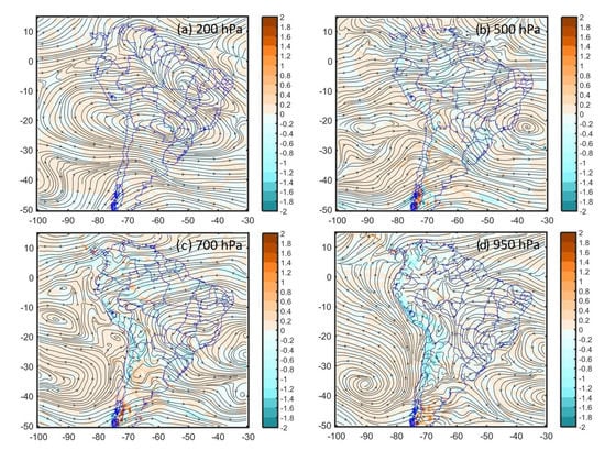 Composites of wind streamlines (m s) and mean vertical velocities (Pa s) for the event on 17 January 2018 at 18 UTC (13 LT) for high levels: (a) 200 hPa, mid levels: (b) 500 hPa, (c) 700 hpa and low levels: (d) 950 hPa. Positive values indicate downdraft vertical winds and negative values indicate updraft vertical winds. All composites data were obtained from GFS-reanalysis data (resolution: 0.5). Longitudes, latitudes and contours of the MRB and Mantaro valley are indicated.