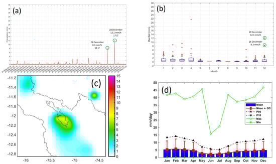 The time series of the accumulated hourly rainfall rate (mm h) measured by in situ pluviometers above the HYO during December 2019 is shown in Figure 6a. Two events with high rainfall rates were observed: the first one occurred on 26 December at 19 LT with a peak of 8.3 mm h and the second on 28 December at 17 LT with a peak of 12.1 mm h. It was observed that these two events lasted for only two hours and occurred on with only one day of separation. As in the previous case, these rainfall events are extreme in the sense of that they are outliers in a boxplot and whiskers diagrams, which are shown in Figure 3b. It was observed that during December 2019, the events mentioned above are the higher outliers with a rainfall median close to 0.5 mm h and a maximum value close to 2.1 mm h.
