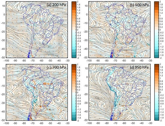 Furthermore, using wintertime in situ daily minimum temperature observations from Argentina, Bolivia, and Peru and ERA-40 reanalysis over the 1975–2001 period, ref. [] investigates the spatial and temporal characteristics of the cold surges propagating northward along the eastern flank of the Andes from subtropical to tropical South America. On average, three to four cold surges are reported each year. Before these cold surges reach the tropical region, they are characterized by the higher occurrence of a specific circulation pattern associated to southern low-level winds progression toward low latitudes combined with subsidence and dry conditions in the middle and low troposphere that reinforce the cold episode through a radiative effect.