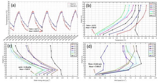 It is important to note the continuous decrease (increase) of minimum temperatures during the days preceding (following) the occurrence of this extreme frost event. Moreover, Figure 8b shows the mean hourly temperature vertical profiles between 02 LT and 08 LT for the event on 21 June 2018 above the HYO. At night hours, very stable conditions of the surface boundary layer, with positive lapse rates close to 0.27 C m and minimum temperatures close to −2.5 C at 07 LT, were observed.