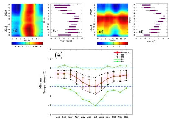 Moreover, the monthly and diurnal cycles of mean hourly temperatures at a height of 2 m above the HYO between July 2017 and July 2018 are shown in Figure 9a. In general, maximum mean hourly temperatures were observed between September and November at around 12 LT and 15 LT with values close to +18 C. Meanwhile, minimum mean hourly temperatures were observed during April and July between 00 LT and 07 LT with values of around +2 C. Furthermore, the variations of monthly minimum temperatures quantiles (boxplot) are shown in Figure 9b. The minimum values of monthly minimum temperatures were observed in June, July, and August with values between −2.0 C and −4 C.