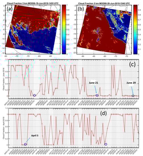 (a) Spatial distribution of cloud fraction obtained by MODIS sensor onboard of Terra satellite above the HYO for 19 January 2018 at 1455 UTC (955 LT). (b) Spatial distribution of cloud fraction obtained by MODIS sensor onboard of Terra satellite above the HYO for 20 January 2018 at 1540 UTC (1040 LT). One indicates completely overcast sky and zero indicates complete clear sky conditions. Longitudes, latitudes and geopolitical contours are indicated. Time series of cloud fraction obtained by MODIS sensor above the location of the HYO during (c) June 2018 and (d) April 2019.