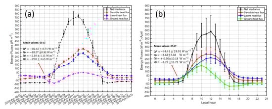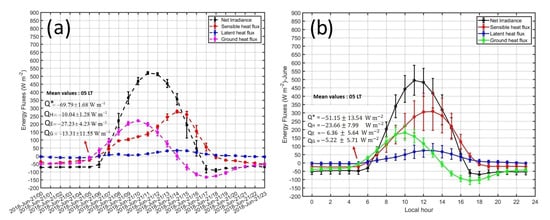 On the other hand, the daily cycle of mean hourly values and standard deviations of the energy balance components during the frost event on 21 June 2018 are shown in Figure 11a. During early morning hours (05 LT), the net irradiance (Q) had minimum values close to −69.8 W m, the sensible heat flux (Q) showed minimum values of around −10.0 W m, the latent heat flux (Q) showed minimum values of around −27.2 W m, and finally, the ground heat flux (Q) presented minimum values close to −13.3 W m. These mean hourly values of the energy balance components were significantly lower than those during June 2018, which are shown in Figure 11b, with the exception of Q whose value is higher than the mean monthly value. During night hours, the mean monthly values of Q showed minimum values close to −51.15 W m, Q showed minimum value close to −23.66 W m, Q showed a minimum value close to −6.36 W m, and finally, Q showed a minimum value of around −5.22 W m. It is important to highlight that the imbalance term (Q − Q − Q − Q) was equal to −19.21 W m at 05 LT.