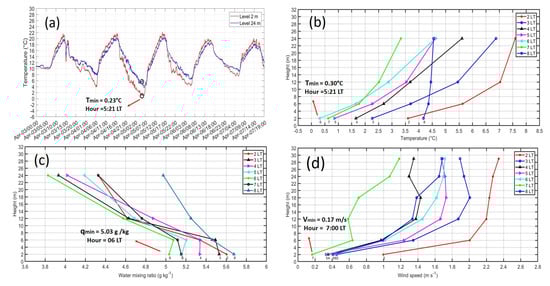 Moreover, Figure 12b shows the mean hourly temperature vertical profiles between 02 LT and 08 LT on 5 April 2018 above the HYO. At night hours, very stable conditions of the surface boundary layer with positive lapse rates higher than the previous frost event, with values close to +0.34 C m, were observed. Moreover, it was also the minimum temperature was higher than the previous frost event, with values close to +0.30 C at 06 LT.