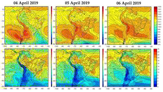 Contours of pressure reduced to sea level (hPa) and contours of specific humidity (g kg) for South America (first column) on 4 April 2019 at 12 UTC (07 LT), (second column) on 5 April 2019 at 12 UTC (07 LT) and (third column) 6 April 2019 at 12 UTC (07 LT). Geopolitical contours are indicated.