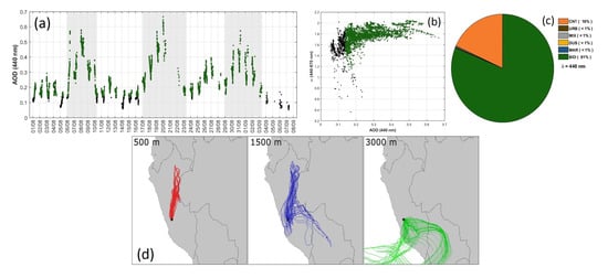 In 2019, between August and September, a large number of forest fires occurred in the Amazon region, mainly in Brazil and northern Bolivia. The large number of aerosols generated by these fires affected several regions of South America, including Peru. Several events with high aerosol loads were recorded during these months in the HYO, as shown in Figure 15a. The behavior of the AOD between 1 August and 8 September 2019 and, as can be seen, practically every day, the aerosols generated by the biomass burning (green dots) were recorded. A total of three events with high AOD values are highlighted, especially the ones recorded between August 17 and 23, where the maximum AOD value with a value of 0.67 recorded on August 20 at 12:30:56 UTC (07:30:56 LT) took place.