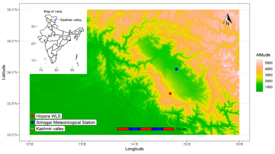 The valley of Kashmir lies between 33°20′ to 34°54′ N latitudes and 73°55′–75°35′ E longitudes covering an area of approximately 15,948 km2 and is surrounded by Karakoram range in the north, Pir-panjal range in the south and west, Zanskar range in the east, and Siwalik hills towards the south.