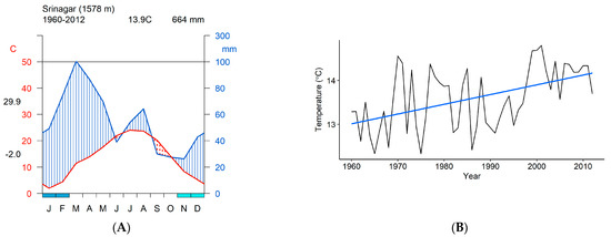 (A) Monthly climate diagram of Srinagar based on instrumental data from Srinagar meteorological station. (B) The long-term mean annual temperature of Srinagar (1960–2012).