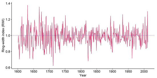 The standardized site chronology showed high first-order auto-correlation values because of the impact of the previous year’s weather on current year’s tree growth. This persistence in the standard chronology was removed by autoregressive modeling and the resulting residual series were averaged by computing the bi-weight robust mean to make a residual site chronology [37] (Figure 3).