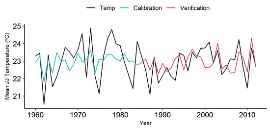 A linear regression was computed between the tree-ring width series and mean June–July temperature for the period 1960–2012. The skill of the climate-reconstruction model was assessed using calibration and verification statistics (Figure 4). Verification statistical parameters included the reduction of error (RE), coefficient of efficiency (CE), and root mean squared error (RMSE) [40].