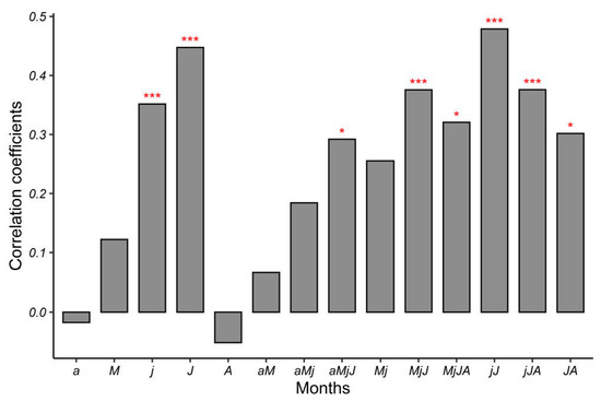 Correlation coefficients between radial growth of A. pindrow and monthly as well as multi-month combination temperature from current April to August (The horizontal tick labels show the current year months and monthly combinations from April-August and the asterisk marks * & *** above bars show statistical significance at p < 0.05 and p < 0.01, respectively).