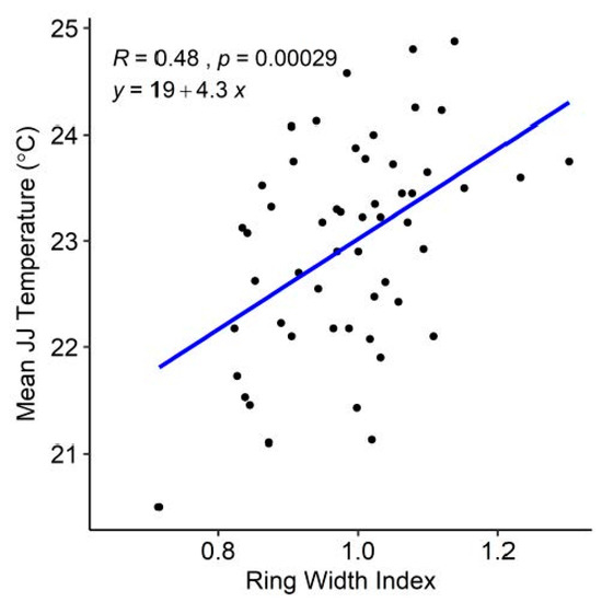 Linear regression between mean June–July temperature and ring width indices.