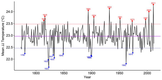 The 10 coldest years in reconstruction (Figure 7), in increasing order, were 1823, 1962, 1822, 1833, 1900, 1899 1831, 1849, 1780, and 1974 while the 10 warmest years, in decreasing order, were 2011, 1932, 1894, 2003, 1816, 1904, 1951, 1997, 1814, and 1973, with 1823 being the coldest summer and 2011 the warmest with mean JJ temperature of 21.66 °C and 24.30 °C, respectively. Seven of the 10 warmest years were seen after the beginning of the 20th century while seven of the coldest years were seen prior to the 20th century. On a decadal scale, the 10 warmest decades were 1810, 1900, 1970, 1930, 1850, 1880, 1780, 1990, 1950, and 1870, with 1810 being the warmest decade with a decadal mean temperature of 23.2 °C. The 10 coldest decades in the reconstruction were 1820, 1890, 2000, 1960, 1860, 1980, 1910, 1940, 1790, and 1840 with 1820 being the coldest decade with a decadal mean temperature of 22.7 °C. Nevertheless, the 20th century is clearly the warmest century with a mean annual JJ temperature of 22.99 °C, including 5 of the 10 warmest decades. The coldest years in the chronology did not correlate with any known volcanic eruption because known eruptions occurred far away from the study site.