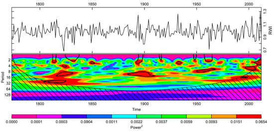 The variability of reconstructed JJ temperature of Srinagar was further investigated in the spectral domain (Figure 8). Wavelet analysis of JJ temperature reconstruction revealed significant spectral peaks between 2–14 year cycles; however, the occurrence of these cycles is temporally unstable.