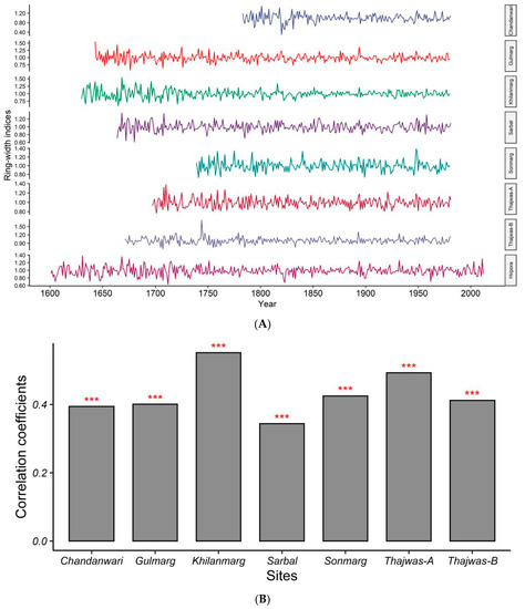 (A) Residual site chronologies of Hirpora and various sites sampled by M K Hughes [17,18]. (B) Correlation plot showing correlation coefficients between Hirpora and other residual site chronologies (The asterisk marks *** above bars show statistical significance at p < 0.01).
