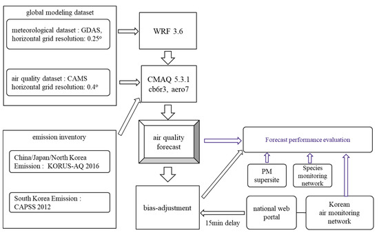 The bias adjustment technique was applied to remove the bias of PM2.5 forecast using the previous days’ PM2.5 observation and forecast. The GMAF retrieved the hourly PM2.5 measurements from the criteria air pollutant monitoring network with a 15 min delay. The collected hourly measurements were averaged at the end of the day to calculate the daily mean PM2.5 concentration for the use of bias adjustment.