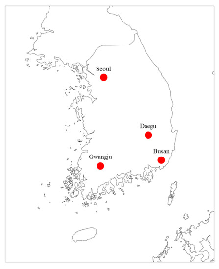The first national air quality standard for PM2.5 was promulgated in Korea in 2015 to begin installation of a PM2.5 monitoring instrument at the criteria air pollutant monitoring station. Most of the criteria air pollutant monitoring stations in the urban area were equipped with a PM2.5 monitoring instrument by 2016. Furthermore, KORUS-AQ field campaign was conducted in the spring of 2016 to provide the measurements from aircraft, ground sites and ships. The KORUS-AQ emissions were also developed to support the campaign [32]. Taking into account availability of monitoring data and emission inventory, this study chose the period from December of 2015 to November of 2016 for verification and evaluation of the GMAF. Four major cities in Korea were selected as target areas. Those are Seoul, Busan, Gwangju, and Daegu as displayed in Figure 3.