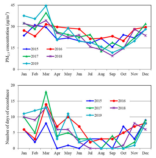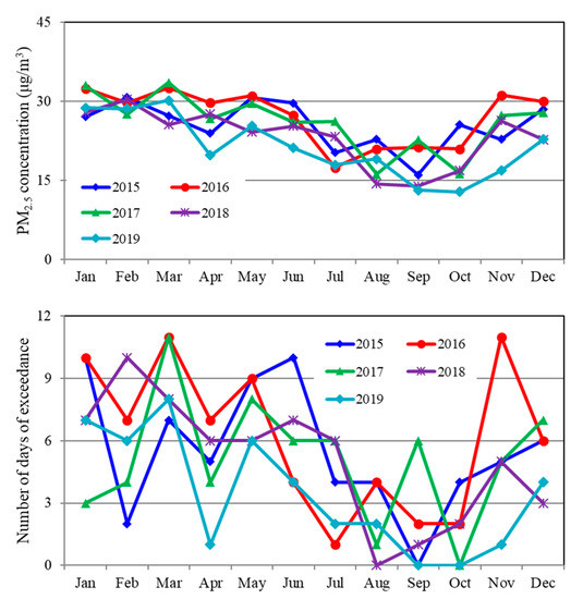 Monthly mean PM2.5 concentrations (top) and the number of days exceeding 35 μg/m3 of PM2.5 (bottom) obtained from the Korea air monitoring network in Busan.