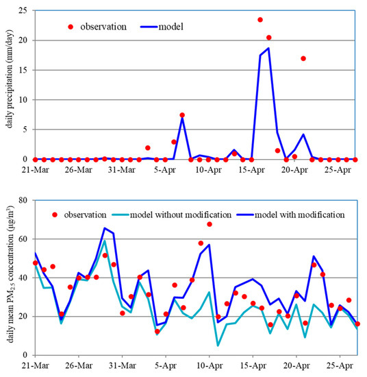 Modeled and observed daily precipitation (top) and daily mean PM2.5 concentrations (bottom) at Seoul.