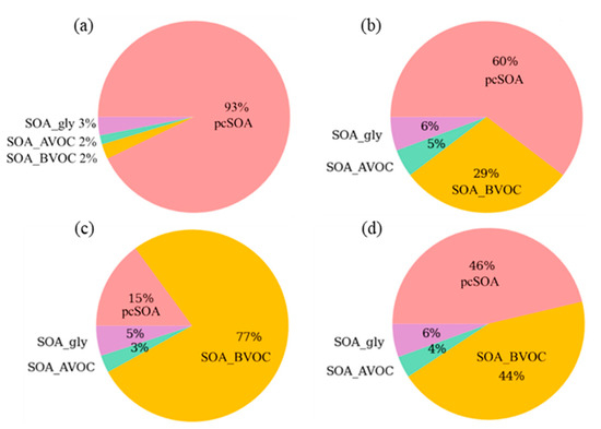The pcSOA production rate of the AERO7 module was optimized for the southern and northern California sites and was known to overestimate the SOA in the continental US application [40]. Figure 7 displays the model calculated SOA compositions by season in Seoul. Here, the SOA was divided into four groups, pcSOA, SOA from biogenic VOCs (SOA_BVOC), SOA from anthropogenic VOCs (SOA_AVOC), and SOA from glyoxal and methylglyoxal (SOA_gly) for convenience. The pcSOA was the most dominant SOA in the winter due to low temperatures whereas the SOA_BVOC was the most dominant SOA in the summer due to high emission fluxes of biogenic VOCs and fast photochemical production. These seasonal characteristics of SOA compositions appeared similarly in most urban areas in Korea.