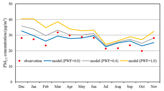 Observed and forecasted monthly mean PM2.5 concentrations at Seoul with the pcSOA weighting factors (PWF) of 0, 0.4 and 1.0.