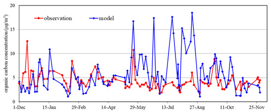 Monthly observed and forecasted organic carbon concentration at the Bulkwang PM supersite.