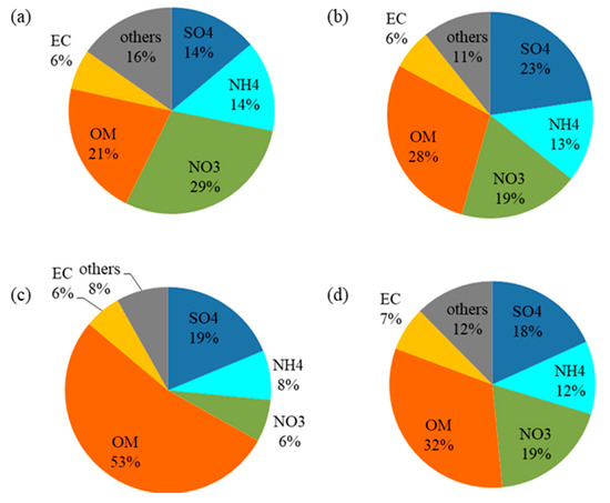 Modeled chemical compositions of PM2.5 in winter (a), spring (b), summer (c), fall (d) at Seoul in 2016.