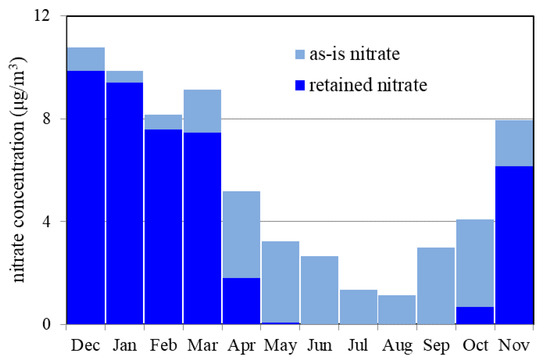 The monthly mean concentrations of the retained nitrate at the Bulkwang site were calculated by applying Equation (5) to the temperature and the humidity forecasted by WRF and the nitrate concentration modeled by CMAQ. As displayed in Figure 11, both the as-is and retained PM2.5 nitrate concentration were the highest during the winter months and the lowest during the summer months because the ratios of nitrate aerosol to nitric acid gas (NO3−/HNO3) decrease with temperature increase. In the summer months, the nitric acid mainly stayed in the gas phase due to the warm temperature. It may be noted that the nitric acid gas is readily removed by wet and dry deposition to have shorter lifespan than the nitrate aerosol.