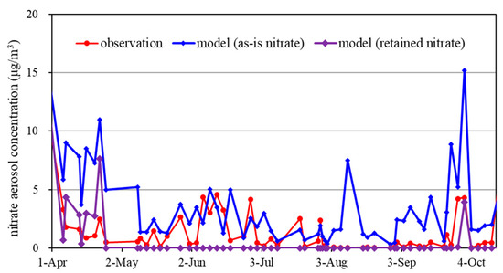 Figure 12 compares the observed nitrate with the modeled nitrate between April and October during which Equation (5) predicted a significant evaporation loss of nitrate as shown in Figure 11. As the nitrate was measured every three days, the modeled nitrate concentrations were also selected every three days in the Figure 12. The modeled retained nitrate agreed well with the observed nitrate in April, August, September, and October, indicating that Equation (5) calculated the nitrate evaporation loss accurately. The retained nitrate concentrations were kept below 5 μg/m3 to lessen the nitrate overestimation appeared in the as-is nitrate concentration. However, the observed nitrate was closer to the modeled as-is nitrate than the modeled retained nitrate about half of May, June and July. This underestimation of the retained nitrate is probably due to inaccurate estimation of the temperature to which the nitrate evaporation loss is sensitive.