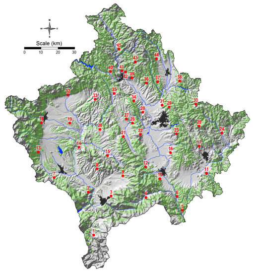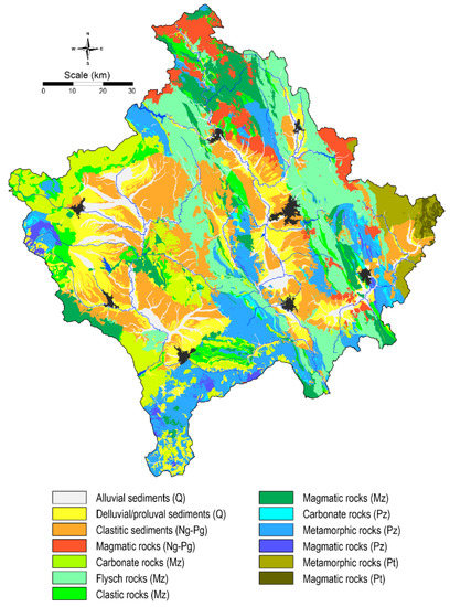 Kosovo is situated in the Balkan Peninsula within the longitudes 41°50′58″ and 43°15′42″ and within the latitudes 20°01′30″ and 21°48′02″. It lies over a surface of 10,900 km2 and it is characterized by an average altitude of about 800 m above sea level. Geologically Kosovo is composed of a complex setting of formations. There is also a high mineral activity of Pb-Zn, Cu, Ni and Cr positioned in different parts of the territory. The total estimated land is at 858,063 ha and about 63.3% is agricultural land area and 35% is forest area. The geology of Kosovo is complex, with formations created at different intervals of geological timeline (Figure 1). Metamorphic, flysch, carbonate rocks and clastic sediments appear to cover most of the area. Then, there are deluvial/proluvial sediments mostly in the west, south and to the east of the territory, magmatic rocks mostly are found in the north and the east and magmatic rocks mostly in the north and north/east. There are also alluvial sediments which lie along the river basins, such as Drin, Sitnica and Morava rivers.