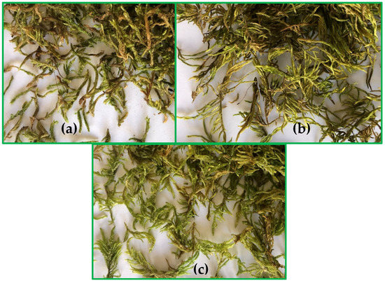 Types of mosses collected: (a) Hypnum cupressiforme Hedwig, 1801, (b) Homalothecium sericeum (Hedw.) Schimp. 1851, (c) Pseudoscleropodium purum (Hedw.) M.Fleisch.