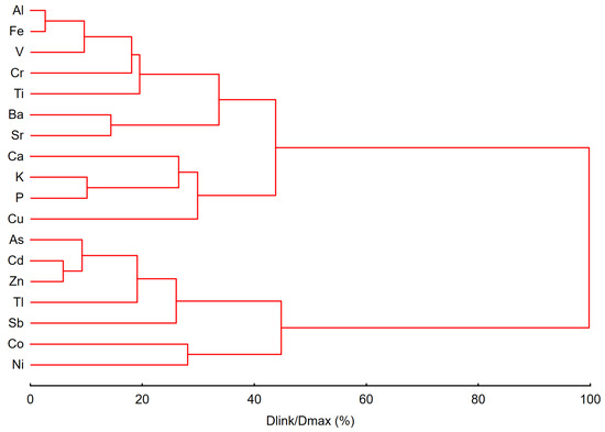 The association of elements was performed by hierarchical cluster analysis and factor analysis, based on the Pearson’s correlation coefficients between elements. The Pearson’s correlation coefficients of 25 elements analyzed in 45 moss samples are given in Table 3. There are 24 significant correlations with values of Pearson’s coefficient between 0.5 and 0.94, of which 18 have values ≥0.5 and ≤0.7, whereas six of them were ≥0.7. Since there are e lot of numbers, the significant Pearson’s coefficients shown in the table are given in bold so that they can be easily noticed. The strongest association is that of Fe and Al with a value 0.94 and they also have been found in great correlation in other works [35,36,41,42]. High correlation was found also for K and P with a value of 0.79.
