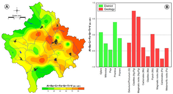 Factor analysis revealed four groups of elements which associated mostly to the given factor (four factors). Factor 2 can be considered as an anthropogenic factor, whereas factors 1, 3 and 4 are mixed factors, because they do not seem to be loaded significantly only by elements which are expected to be mostly or completely of anthropogenic origin. In Figure 5 are shown the spatial distribution map of the first extracted factor (A), and the standard factor values according to five districts of Kosovo and geological formations (B). This factor groups (Al, Ba, Cr, Fe, Sr, Ti, Tl and V), is the strongest factor as it represents the highest value of variability, 24.4% of the total 69.1% explained variance by all four factors. The highest values of this factor score appears in the east of Kosovo. The elements of this factor are considered as naturally distributed as common earth crust’s components. Their provenance can be explained by the settlement of local fine soil particles previously airborne as dust during winds. Heavy rains can send soil particles into the mosses also. The presence of Cr though, can partly be as a result of mining in Novobërdë, cement facility in Hani i Elezit, ferronickel facility in Drenas (Glogovc) and the lignite exploitation in Obiliq. Moreover, Cr was determined to be the most concentrated metal in the lignite coal (19 mg/kg), excavated in Obiliq, for the purpose of electricity generation [43]. Consequently, it can be present in fly ash and transported by winds to other areas. The highest standard values of this factor are those of the district of Prishtina and Gjilan (Figure 5). The district of Prizren represents the third highest standard value of the first factor, where traffic can be considered its main anthropogenic source, apart natural occurrence [44]. As can be seen in Figure 5, according to geological formations, this factor has the highest standard values in the clastitic rocks formed during Paleogene and Neogene periods of the Cenozoic era. These formations occur mostly in the Kosovo and Dukagjini basins but also in the center and other parts of Kosovo. High standard factor values are also found for Paleogene and Neogene magmatic rocks and Mesozoic flysch.