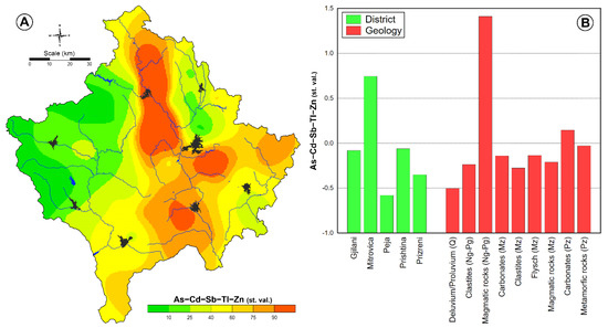 Elements which load most significantly in factor 2 are As, Cd, Sb, Tl and Zn. The distribution map and the standard factor values according to districts and geology are shown in Figure 6. The element loading with the highest value is Zn and Sb load is the smallest of all. This is the second most important factor as it explains 21.4% of the total variance throughout the variables. In this group As, Cd and Zn are of anthropogenic origin as they are always associated with industrial activities [37,40,45]. However, it was found that Sb also co-exists with ores PbS and ZnS in the area of Trepça mines [46]. In a study performed in 2006 on the distribution of heavy metals in floodplain of agricultural soil along the Ibër River in the district of Mitrovica, almost the same group of elements was revealed by multivariate analysis [46]. These elements can be transported from this agricultural area by wind, to mosses locations during dry seasons lodged in fine particles of dust and this way contributing to factor 2. As can be seen in the distribution map of factor values, the highest values of this factor are spread along the Kosovo basin, it extends from Leposaviç in the north to the south in the Hani i Elezit, with a branch in the east between the city of Prishtina and Gjilan. The presence of these elements in this group clearly is a result of the pollution introduced into the atmosphere from anthropogenic activities. Industrial sites are located all along the Kosovo basin, starting in the north with the Trepça mines, lignite coal quarries and electricity generation plant, Kishnica mineral processing facility, Magnezite mine in Golesh, down to cement production plant in Hani i Elezit. The highest standard value of the second factor (Figure 6B) is for the district of Mitrovica, which is expected because of heavy mineral exploitations and processing in that area; hence, the presence of factor 2 elements in the moss samples. Prishtina and Gjilan districts have also high factor 2 standard scores, which indicates that these two regions are also exposed to air pollution from industry. Particularly, regarding Prishtina, not only is it easily accessible for polluted air coming from Obiliq (lignite powered power plants) and Mitrovica (Trepça facilities and tailings), but also there is heavy usage of lignite coal in the city for domestic heating during winter and also there is very dens traffic, which obviously increases the introduction of these elements as pollutant in the atmosphere [32,47]. According to geological formations, the highest standard value of the factor 2 is found in magmatic rocks of Neogene and Paleogene periods. These formations cover relatively small areas and are found mostly in the north and the east of Kosovo, in the districts of Mitrovica and Prishtina. Antimony and Tl are found at higher concentrations in the north in Stanterg and Zveqan, probably with both geogenic and anthropogenic origin. Paleozoic era carbonates and metamorphic rocks also show high standard values for factor 2, although much lower than magmatic rocks.