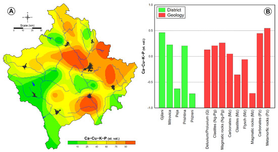 Factor 3 groups four elements, Ca, Cu, K and P, and it explains 14.2% of the total variance (Figure 7). The distribution map of the factor values, as well as its standard values according to districts and geology of the studied area, are given in Figure 8. The highest values of the third factor are concentrated in the center and the south of Kosovo, around the lignite quarry in Obiliq and the cement plant in Hani i Elezit. This factor’s standard values are the highest for the district of Gjilani, Mitrovica and Prishtina. This group is composed mostly by naturally occurring elements; however, anthropogenic origin is to be considered. K and P are widely used in agriculture as fertilizers, thus, during dry seasons K and P enriched soil particles can be carried by winds to mosses habitats. Ca, K and P are also found in significant quantities in the fly ash of Obiliq power plant [48], which regularly is spread out by winds and can contribute to the atmospheric deposition on mosses. Cu is mostly of anthropogenic origin and it is probably related to mining processes. Moreover, Cu is also found in fly ash of Obiliq power plant [48], but it can also reach mosses habitats from traffic emissions, since road environment was found to contain among other metals Cu which originates from vehicular usage [44,49,50].