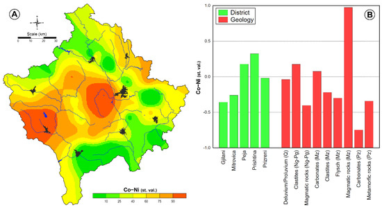 Figure 8 shows the elements grouped by factor 4. This is the weakest factor constructed by only two elements, Co and Ni and explaining only 9.1% of the total variance. Its distribution map shows that the highest values appear in the center of Kosovo and in the west. The highest standard value is that of the district of Prishtina, then Peja and Prizren have slightly smaller values. Ni presence in this group can be explained by the ferronickel smelter in Drenas where the ore concentration takes place and its mine in Golesh (Harilaq sampling point), both of these located around the center of Kosovo. However, no Co involving industry or processing of ore containing Co takes place in Kosovo, probably its origin is mostly natural, as it may be for Ni in the west of Kosovo. The geological formation with the highest standard value of the fourth factor is magmatic rock of Mesozoic era. Neogene and Paleogene clastites come second, then Mesozoic carbonates and Quaternary deluvial/proluvial deposits also show high standard factor values.