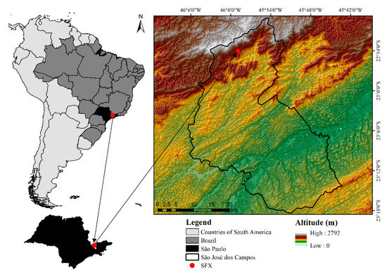 This study was performed in the Ecohydrologic Experimental Station of São Francisco Xavier (EES-SFX) located in São Francisco Xavier (SFX), a district of the city of São José dos Campos (SP), approximately 1100 m above average sea level (Figure 1). The EES-SFX comprises the experimental branch of the Laboratory of Isotopic Ecohydrology (LabEcoh) of the National Institute for Space Research (INPE). The region is characterized by the presence of remnants of the Atlantic forest [23] and is one of the slopes of the Paraíba do Sul River Basin.