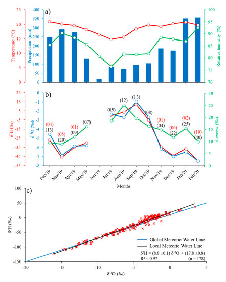 For the entire analysis period, the weighted isotopic average of rainfall was −5.4‰ (±3.7‰) for δ18O, −30.1‰ (±32.7‰) for δ2H, and 13.2‰ (±6.2‰) for d-excess. The monthly variability of isotopic data (Figure 2b) shows more enrichment in precipitation during the month of September, with an average of −0.9‰ (±1.8‰) for δ18O and 12.1‰ (±10.6‰) for δ2H. The most depleted values occurred during February 2020, with an average of −7.5‰ (±3.6‰) for δ18O and −51‰ (±31‰) for δ2H. On average, the highest value of d-excess occurred in the month of August, with 25.2‰ (±3.9‰), and the lowest average value occurred in March, with 9.0‰ (±5.1‰). The Local Meteoric Water Line presented slope and intercept (δ2H = (8.8 ± 0.1) δ18O + (17.8 ± 0.8)) higher than the GMWL value (δ2H = 8 δ18O + 10) identified by Craig [45], as shown in Figure 2c.