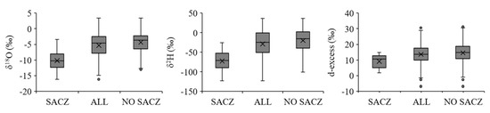 Boxplot of isotopic precipitation composition (δ18O, δ2H and d-excess) during the occurrence of the South Atlantic Convergence Zone (SACZ) during the entire collection period (ALL), excluding the samples during SACZ performance (NO SACZ). The numerical values of the boxplot are in the Supplementary Material (Table S2).