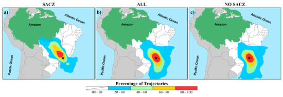 Percent frequency of retrograde trajectory of the air parcel using the HYSPLIT model, calculated for São Francisco Xavier (black star) with 240 h return, at a 2000 m altitude, during (a) the occurrence of the South Atlantic Convergence Zone (SACZ), (b) during the entire collection period (ALL), and (c) excluding the samples during SACZ performance (NO SACZ).
